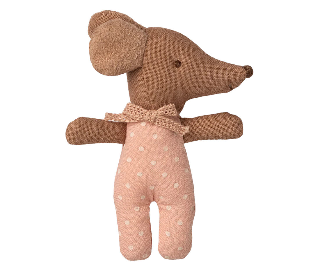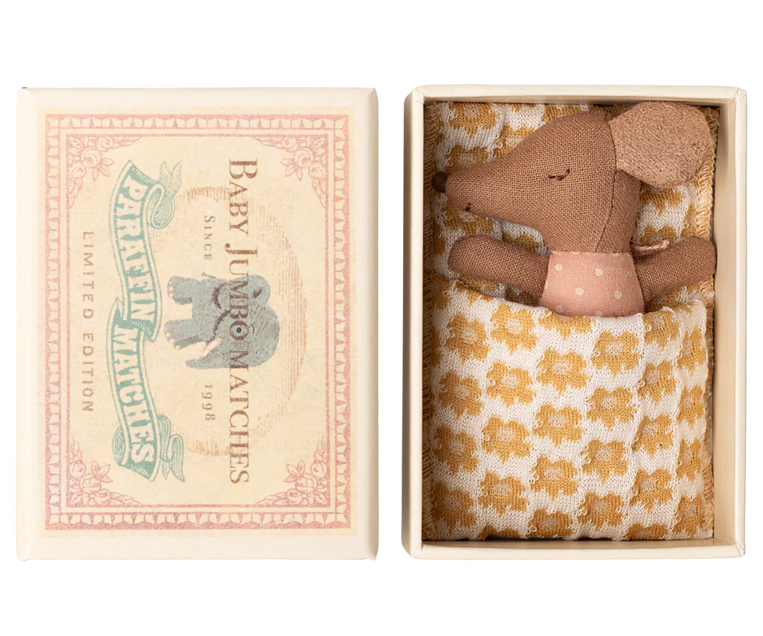 A classic Maileg item. This mouse is ready for hours of play and sleeps tight in the little matchbox. The clothes and bedlinen are made of soft fabrics with unique prints in beautiful colors.