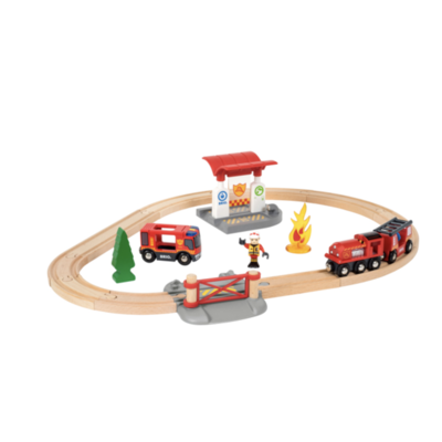 There is a fire and they need your help! Drive immediately to the docking station and fill the fire train with water and gas. The firefighter goes along in his fire truck with sirens and light. Put down the fire with the fire hose on the wagon. For more action, just add more BRIO wooden tracks.