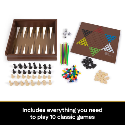 Pull open the distinctive wood cabinet and discover 10 ready-to-play classic family games. From board games to dice games to Pick Up Sticks, there’s a Cardinal Classic game for everyone. Traditional favorites including Left, Center, Right, Chess, Checkers, Backgammon, Chinese Checkers, Mill, Tic-Tac-Toe, Pick Up Sticks, Roll Em, and Mind Magic are all at your fingertips. Made from premium quality materials, this wood cabinet includes 5 dual-sided game boards and everything you’ll need to play 10 different games. It’s a game library that offers your family and friends hours of fun.