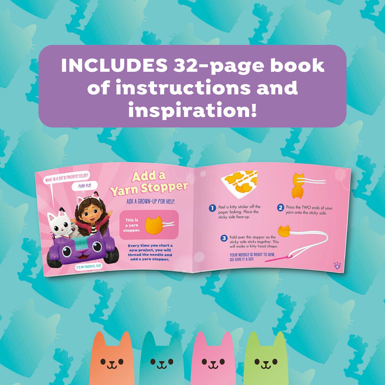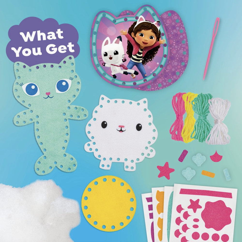 Make your favorite cats and characters from the world of Gabby's Dollhouse. This kit includes everything you need, with none of the guesswork, to help you build beginner skills. Use lacing cards, yarn, and a plastic needle to get the basics down pat. Then move on to the pre-punched felt pieces to create a couple of cat-tastic projects!