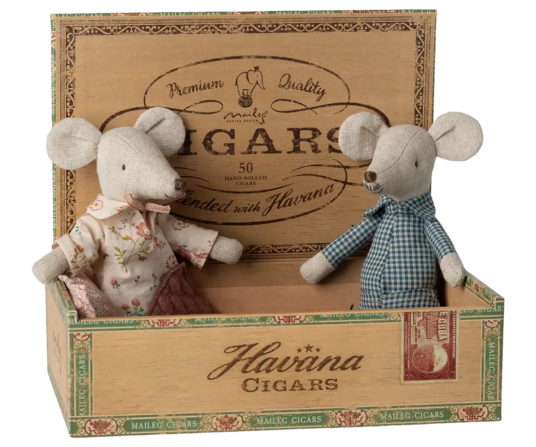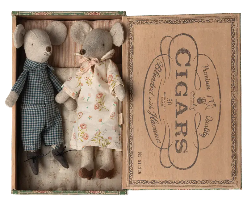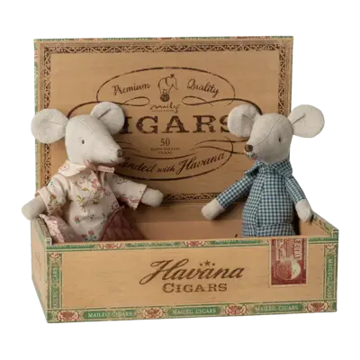 A classic Maileg mouse item. Grandma and grandpa are wearing their nightwear and beautiful shoes. The cigar box is a perfect bed for a good night's sleep. Extend their wardrobe with sets of loose clothes to create a perfect playset.