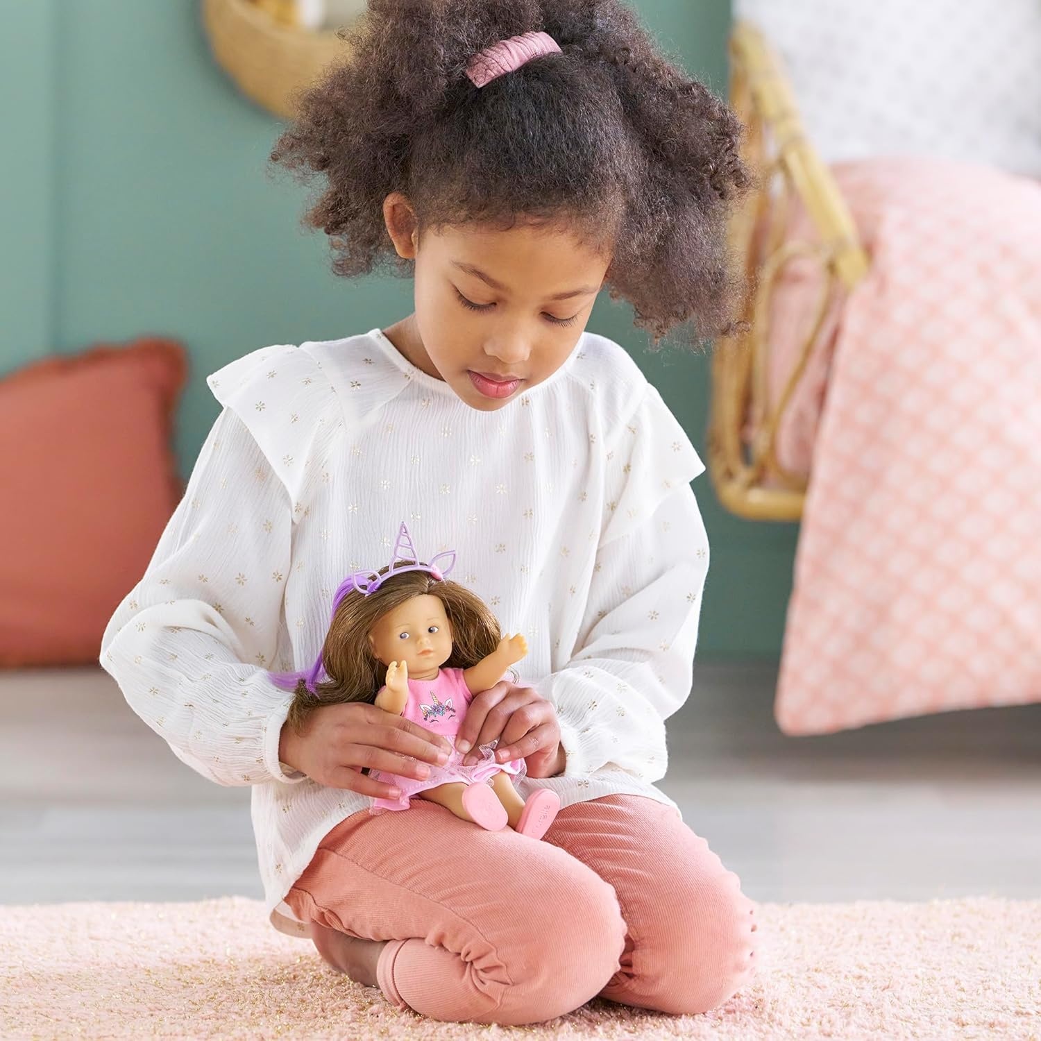The set includes Romy, a petite 8-inch doll in a pink dress with a tulle overskirt sprinkled with gold polka dots and matching molded shoes (not removable), and three accessories: a purple tank top and white shorts with a unicorn print, and a unicorn headband with pink and purple extensions. Mini Corolline Romy has an all-vinyl body that is delicately scented with vanilla -- a Corolle signature, brown painted eyes and long, comb-able brown hair.
