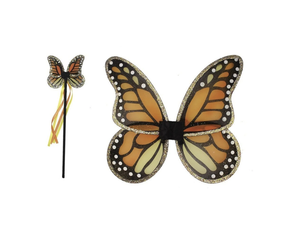 Transform yourself into a butterfly! Our adorable Monarch Butterfly Wings are printed on nylon and have a gold glitter edge detail with flecks of red, blue and green. The elastic straps are covered in satin for a comfortable (size flexible) fit. The matching wand features a stain covered stem, trailing ribbons and the same monarch print on the glittery butterfly! This is a 2 Piece Set, packaged in a gift-ready organza bag.