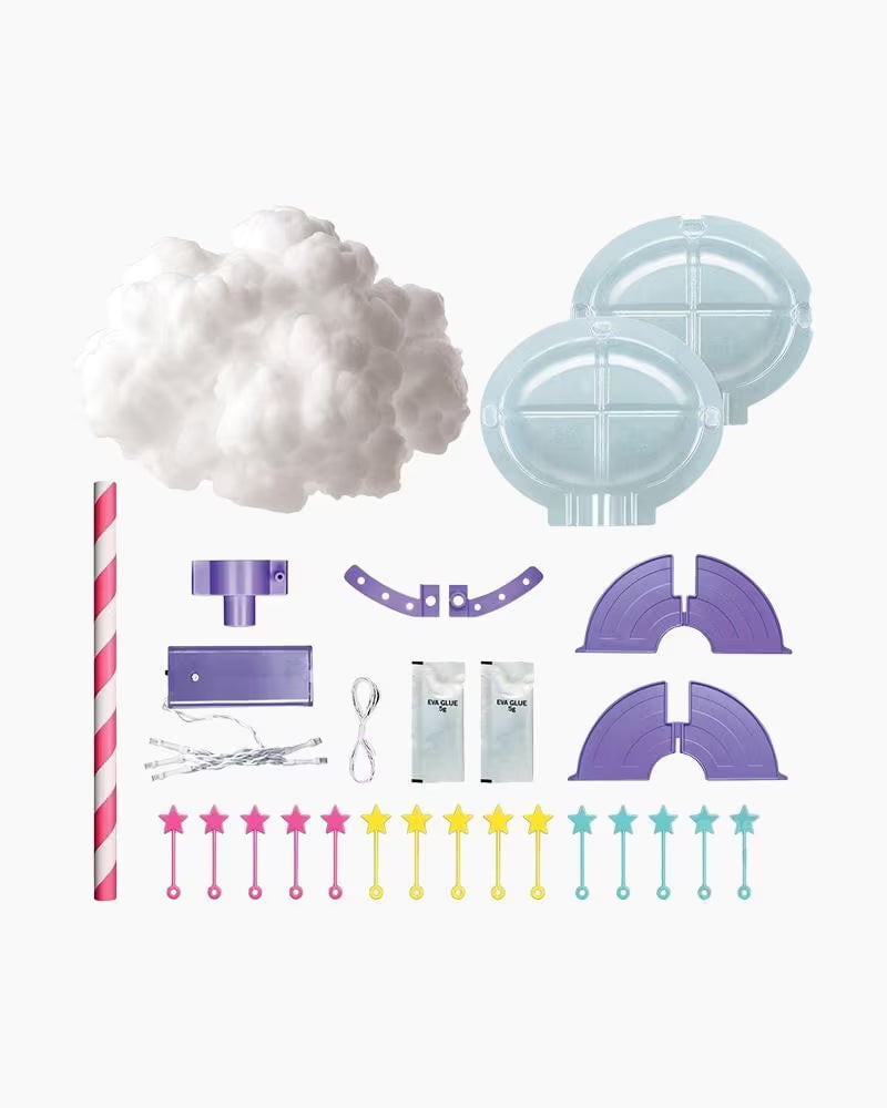 Create a magical glowing cloud that's uniquely yours! This hands-on kit lets kids build their own fluffy 16.5-inch cloud that radiates dreamy light in five rotating colors—green, turquoise, yellow, blue, and red. Why stick with plain bedroom décor when young creators can craft a personalized cloud complete with charming star charms? Perfect for ages 5 and up, this project sparks imagination while filling any space with whimsical, cozy ambiance. Watch as your child's creation transforms their room into a peaceful sanctuary where creativity meets comfort. The perfect blend of DIY fun and enchanting glow!