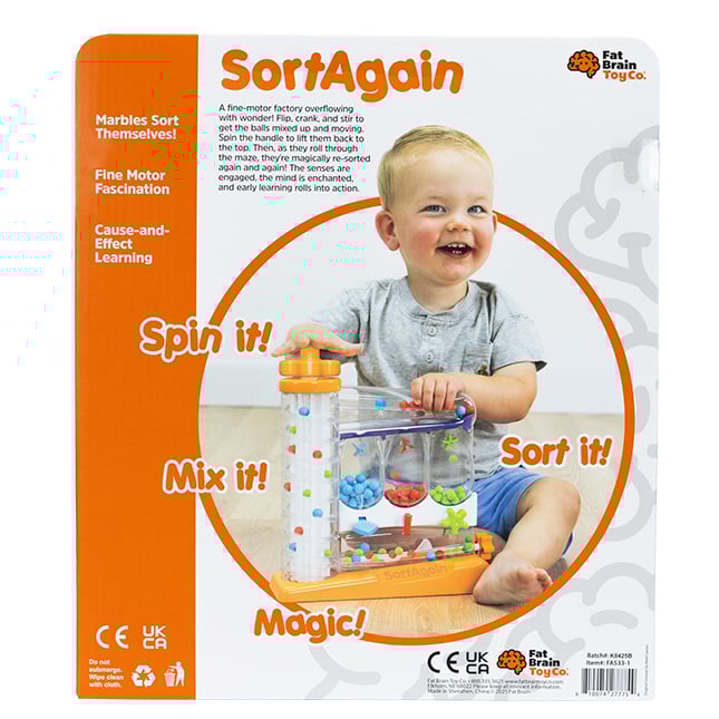 Flip, crank, and stir to get the balls mixed up and moving. Pump and spin to launch them back to the top. Then, as they roll through the maze, they're magically re-sorted again and again! The senses are engaged, the mind is enchanted, and early learning rolls into action with the ever-fascinating SortAgain.