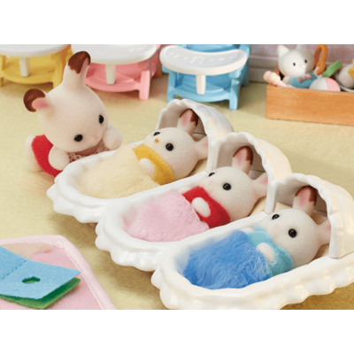 Set includes 3 posable Hopscotch Rabbit Triplets Phillip, Fauna and Flora who are dressed in removable onesies. Care for the newborn triplets at lunchtime and naptime! This ready to play set features rocking triple cradle with three blankets, three sets of highchairs and three sets of matching feeding accessories including plates, cups and cutlery. Expand your collection of triplets figures and play together with the Marshmallow Mouse Triplets and Persian Cat Triplets. Collect more triplet accessories including the Crib with Mobile and Triplets Stroller! Box includes Triplets Care Set.