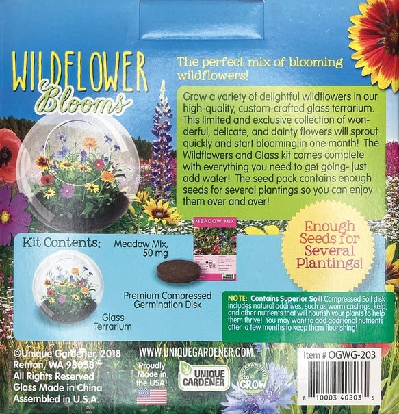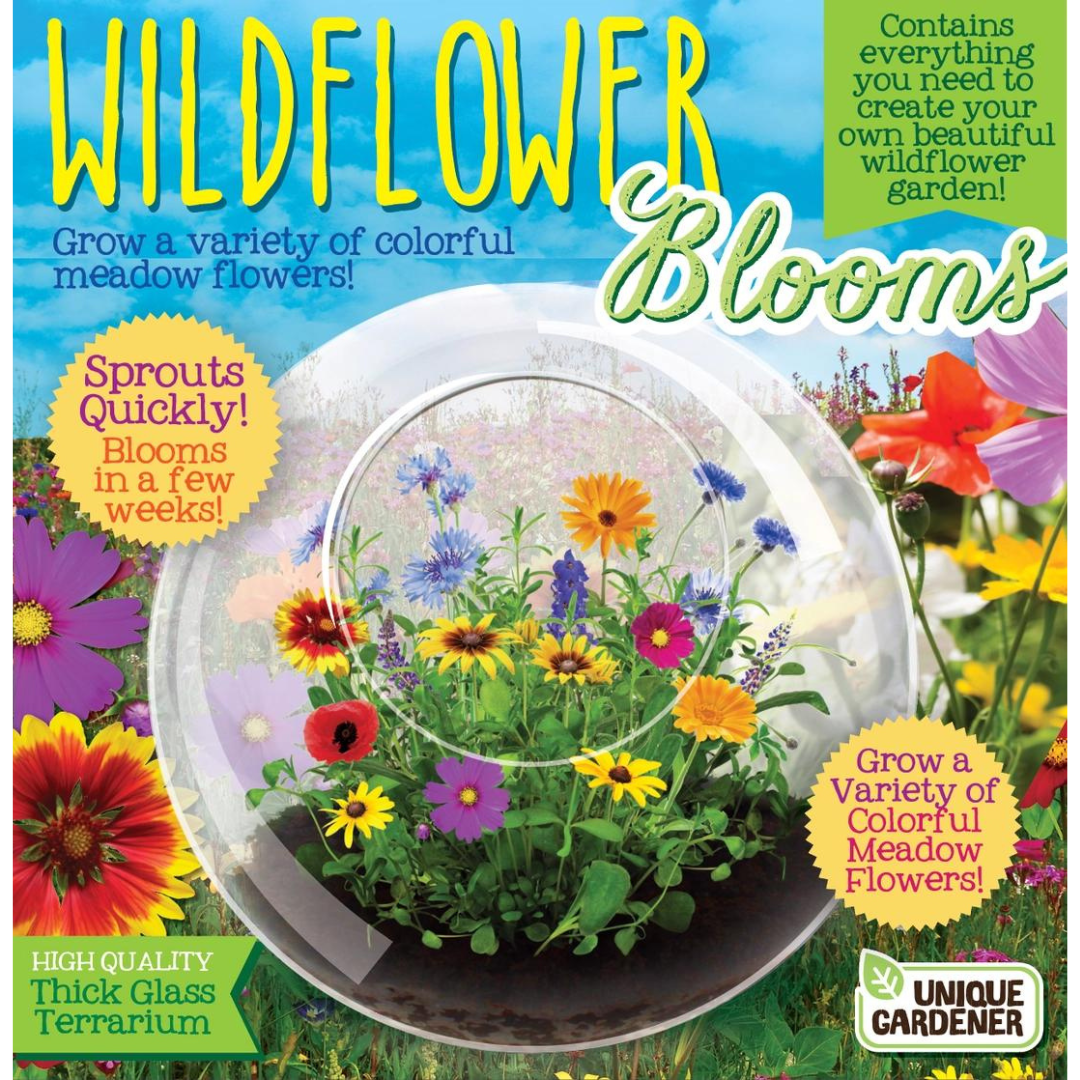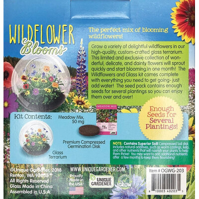 Grow a variety of delightful wildflowers in this high-quality, custom-crafted glass terrarium. This limited and exclusive collection of wonderful, delicate, and dainty flowers will sprout quickly and start blooming in one month! The Wildflowers and Glass kit comes complete with everything you need to get going- just add water! The seed pack contains enough seeds for several plantings so you can enjoy them over and over!